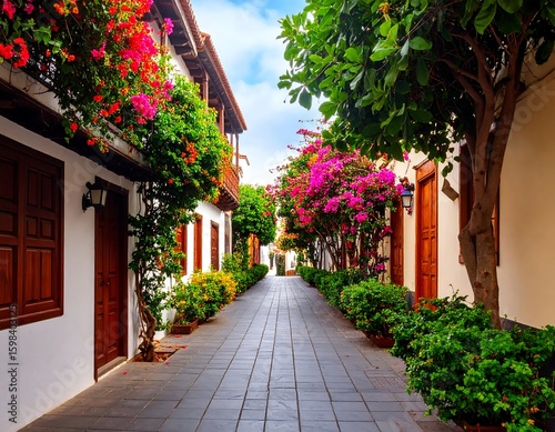 Fototapeta premium Charming, colorful alleyway with vibrant flowers