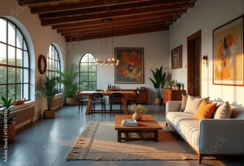 Fototapeta premium Charming Converted Church Loft During Warm Sunset: Industrial Vibe Meets Cozy...