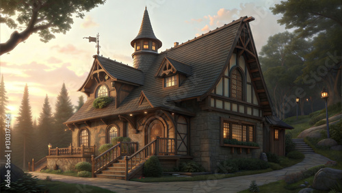 © Arties, Fototapeta premium Charming cottage nestled in the forest at sunset