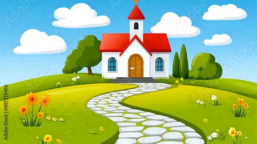 © saf4ry, Naklejka premium Charming Country Church on a Sunny Hillside
