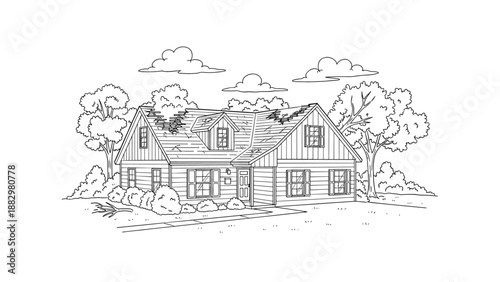 © Ophelia, Obraz premium Charming country house line art with trees and clouds in background