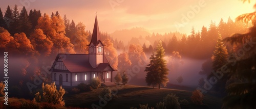 Fototapeta premium Charming Countryside Church at Sunrise with Autumn Foliage and Misty Forest in Background
