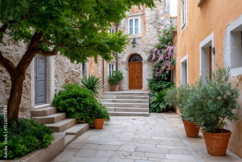© kardaska, Fototapeta premium Charming courtyard with potted plants and blooming bougainvillea in historic european town