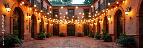© Beniamin, Fototapeta premium Charming courtyard with string lights and potted plants at dusk