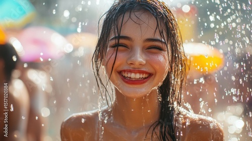 © Pat J., Fototapeta premium Charming cute woman laughing while getting splashed at Songkran festival