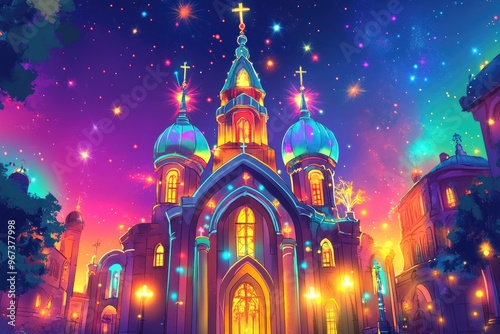 © Giovanni, Obraz premium Charming 2D cartoon illustration featuring a vibrant holy themed background