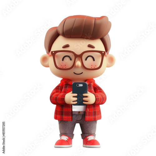 © kitipol, Fototapeta premium Charming 3D character using a smartphone on a white background