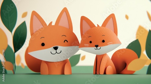 Obraz premium Charming 3D Fox Characters Surrounded by Colorful Leaves in a Playful Nature...