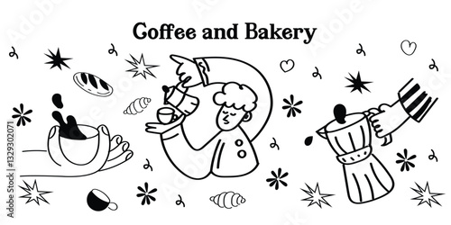 © marcherry, Fototapeta premium Charming doodle-style coffee shop and bakery icons! This vector set features hand-drawn outline illustrations of café essentials, from coffee cups and pastries to brewing equipment and supplies. Perfe