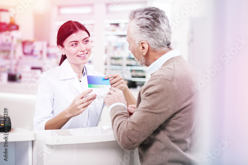 Obraz premium Charming druggist presenting pills to a buyer