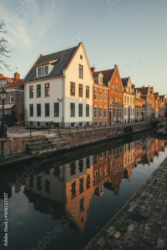 © Marina, Fototapeta premium Charming Dutch canal lined with historic gabled houses at sunset