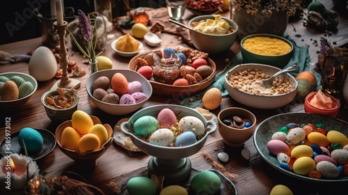 Fototapeta premium Charming Easter eggs in a basket, featuring a delightful array of colors and patterns, perfect for celebrating the season. An ortodox table a full of Easter food, eggs and saint bread.
