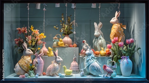 Fototapeta premium Charming Easter window display featuring bunnies, chicks, and spring flowers