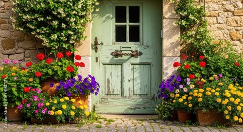 © Tams, Fototapeta premium Charming entrance with weathered door and colorful flower pots.