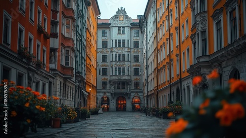 © nurman, Fototapeta premium Charming European alleyway with colorful buildings, ornate architecture, and vibrant orange flowers in planters. A picturesque scene perfect for travel or city life imagery.