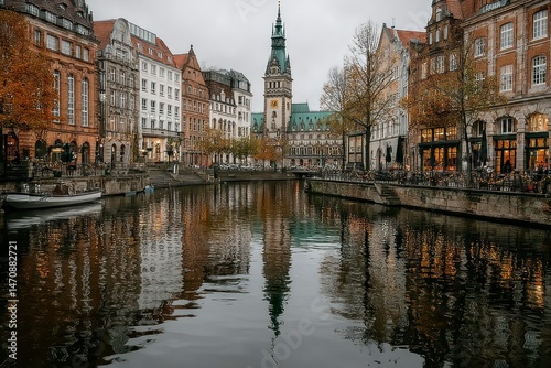 © George, Fototapeta premium Charming European Canal Scene with Historic Architecture and Reflections in the Water