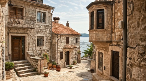 Fototapeta premium Charming European seaside street scene in a historic coastal town with winding cobblestone pathways, stone and terracotta-roofed buildings, lush foliage, overlooking the tranquil sea