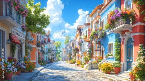 Fototapeta premium Charming European street with cobblestone paths, colorful buildings, and flower-adorned balconies, sunny and inviting