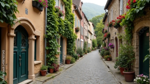 © Burak, Fototapeta premium Charming European Street with Flower Boxes and Ivy
