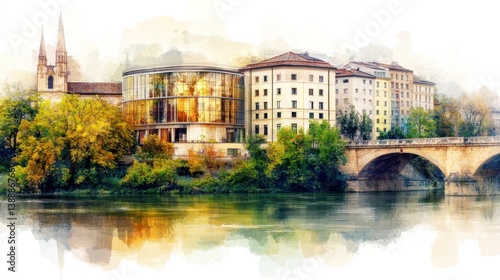 © Tuong, Fototapeta premium Charming European Village by Riverside: Vibrant Reflections, Old World Charm, Sepiatone Aesthetic