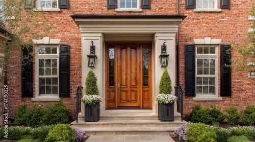 © Ivan, Obraz premium Charming Facade of Two-Story Brick Home Featuring Elegant Wood Grain Front Door with Sidelights