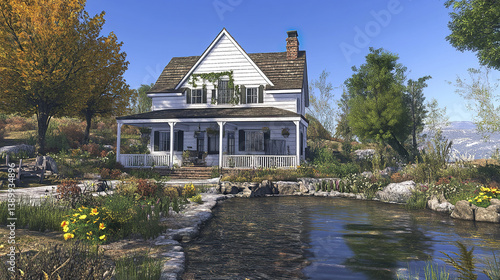© Thanthara, Obraz premium Charming farmhouse with pond and autumn trees in serene landscape