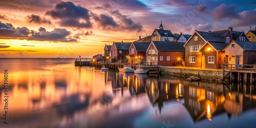 © Arethaawykoff, Fototapeta premium Charming fishing village at dusk, warm golden light on rustic buildings, soft pink hues in the cloudy January sky, calm ocean reflecting the serenity.