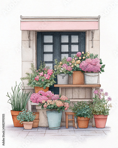 Fototapeta premium Charming Floral Shop Exterior Watercolor Illustration