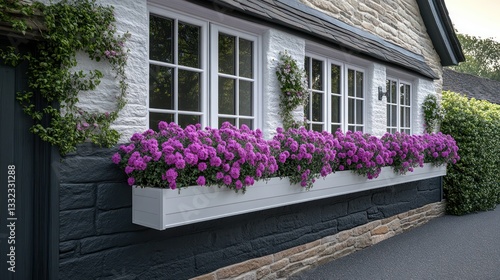 © HERMAWAN, Fototapeta premium Charming flower boxes adorn a stone house facade. Vibrant purple blooms fill the planters, enhancing the exterior