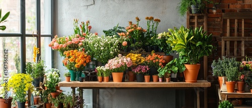 Naklejka premium Charming flower shop interior with various colorful plants and potted arrangements