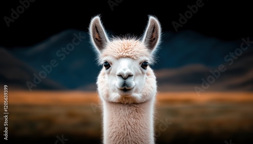 © pisan, Obraz premium Charming Fluffy Llama Posing Against a Vibrant Peruvian Landscape A Captivating Blend of Wildlife and Andean Culture This stunning photograph showcases a fluffy llama with a captivating expression