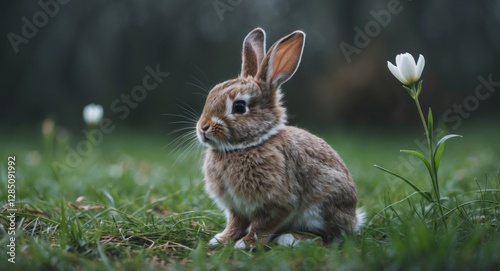 Fototapeta premium Charming fluffy young rabbit perched on green grass with a natural backdrop....