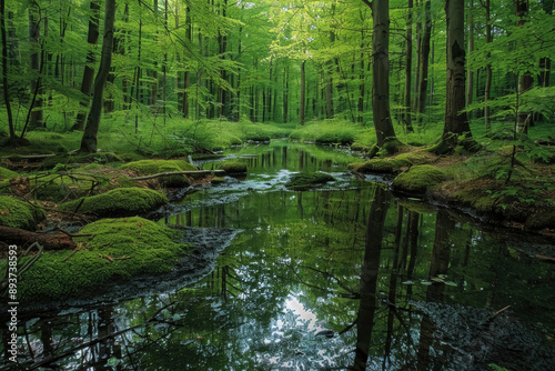 © MK studio, Obraz premium Charming forest landscape with a calm forest stream. Reflections of trees and sky flickering on the surface of the water. Green surroundings with moss-covered rocks and wildflowers.