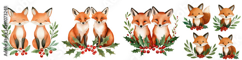 Fototapeta premium Charming fox illustrations adorned with festive wreaths and berries, perfect...
