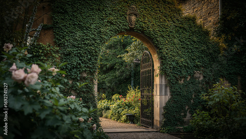 © janzwolinski, Obraz premium Charming Garden Archway Framed by Lush Greenery and Flowers