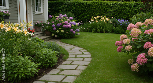 © ERWIN, Obraz premium Charming Garden Displaying Colorful Hydrangeas And Stone Pathway Landscaping Beauty