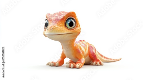 © Denys, Obraz premium Charming gecko character in shades of orange and yellow, with big eyes and a curious expression, playfully smiling against a white background, adding a lighthearted touch to any design