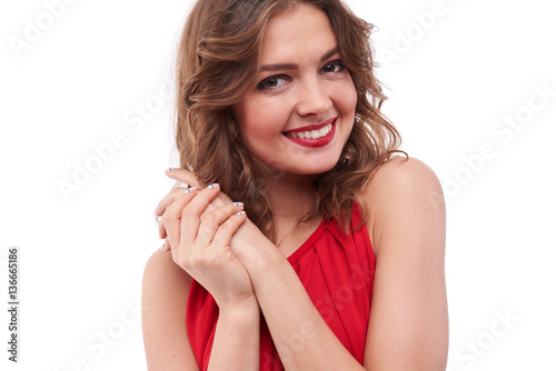 © ArtFamily, Fototapeta premium Charming girl holding hands together while posing at the camera