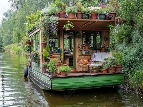 © Daria, Obraz premium Charming green tiny houseboat surrounded by nature, adorned with flowers and cozy seating