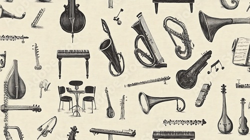 © Keattipoom, Fototapeta premium Charming Hand-Drawn Music Instrument Pattern