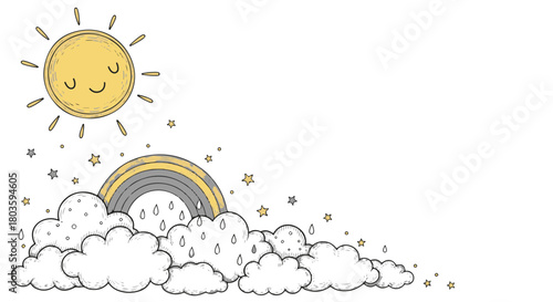 © Clovernand, Fototapeta premium Charming Hand Drawn Sketch of Sunny Day with Rainy Clouds and Arcing Rainbow