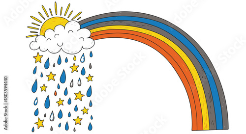 © Clovernand, Naklejka premium Charming Hand Drawn Sun and Rain Cloud with Falling Stars and a Vivid Rainbow