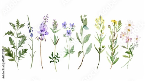 Fototapeta premium Charming Hand - Drawn Vector Watercolor Set: Herbs, Wildflowers, and Spices...