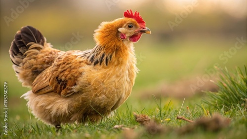 © Normal Desing, Fototapeta premium Charming hen roaming freely countryside farm animal photography natural setting close-up perspective wildlife exploration