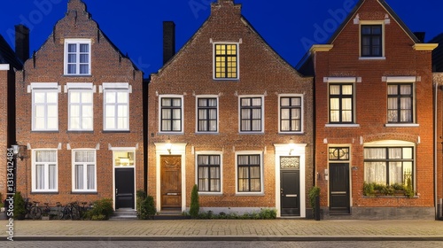 © Artajar, Fototapeta premium Charming heritage architecture in historic european town brick facade residences with glowing windows on a peaceful evening travel destination