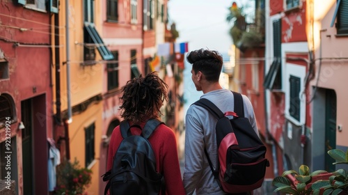 Obraz premium Charming holiday town exploration by couple, deep depth of field, copy space,...
