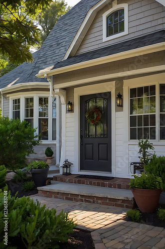 © MatandSterre, Obraz premium Charming Home Exterior with Brick Pathway and Lush Greenery. This inviting house boasts a beautiful front door and well-maintained landscaping, creating a welcoming atmosphere.