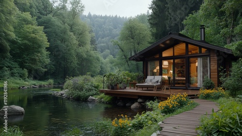 © ZeroOne, Obraz premium Charming House by the River