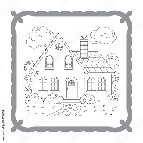 © Graphic Habib, Fototapeta premium Charming House Coloring Page Delightful Outlines for Creative Fun Awaiting Artistic Expression with Clouds, Bushes and a Cute Path