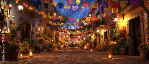 Naklejka premium Charming illuminated street adorned with vibrant decorations and lively...